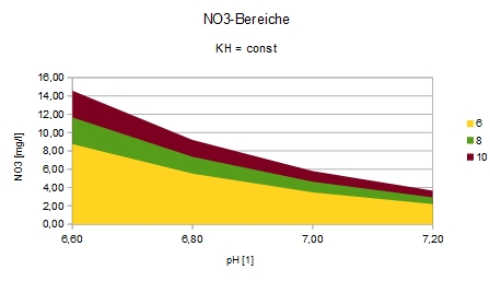 NO3- ~ 10 [mg/l] PO4--- ~ 1 [mg/l] H2O ~ 25 [mg/l] K+ ~ 1,5 [mg/l] von ~ 37,5 [mg/l] bei einer Sauerstoff-Rückführung von ~ 50 [mg/l] ![]() Erinnern wir uns, wie bei bekannter Karbonathärte KH aus dem pH-Wert die CO2-KonzentrationCO2 = Fkt[pH,KH] ![]() abgeleitet