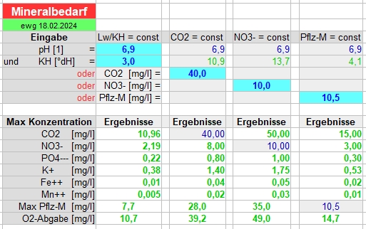 OPTIMIERUNGEN d. Dünger I Nährstoffe NPK-Plus-Dünger Spurenelemente Diejenigen Stoffe, aus denen sich Pflanzen aufbauen und die den Pflanzenwuchs fördern, werden zumeist bezeichnet als Makro-Nährstoffe und Mikro-NährstoffeDünger Dünger = Pflanzenfutter Es wird unterschieden in Stickstoff N, Phosphor P, Kalium K in großem Umfang, aber geringen Mengrn Wir sind ihnen schon begegnet bei Neben-Ionen und Spuren-Ionen ![]() Als Dünger wird das Haupt-Ion Kalium noch extra behandelt. OpTeMa-Dünger-Rechner Der Bedarf für maximalen Pflanzenwuchs ergibt sich aus pH- und KH-Werten und kann einfach berechnet werden: ![]() In den Spalten erfolgen die Berechnungen alternativ je nach bekannten Werten, die in die blauen Felder gesetzt werden. Der pH-Wert ist notwendig, die Karbonathärte KH kann (mit Ungenauigkeit, da strukturabhängig) durch den Leitwert ersetzt werden, entweder KH oder LW! Diesen Bedarfsrechner stelle ich jedem Interessenten gerne zur Verfügung. ![]() Volldünger enthalten Stickstoff N, Phosphor P und Kalium K und werden bezeichnet als NPK-Dünger Plus-Düngern sind weitere (Spuren-)Elemente zugesetzt (Mg, Fe, Mn), es sind NPK-Plus-Dünger Für Wasserpflanzen können Volldünger schnell erstellt werden aus Kaliumnitrat und Kaliumphosphat (K3PO4 bzw K2HPO4 bzw KH2PO4)