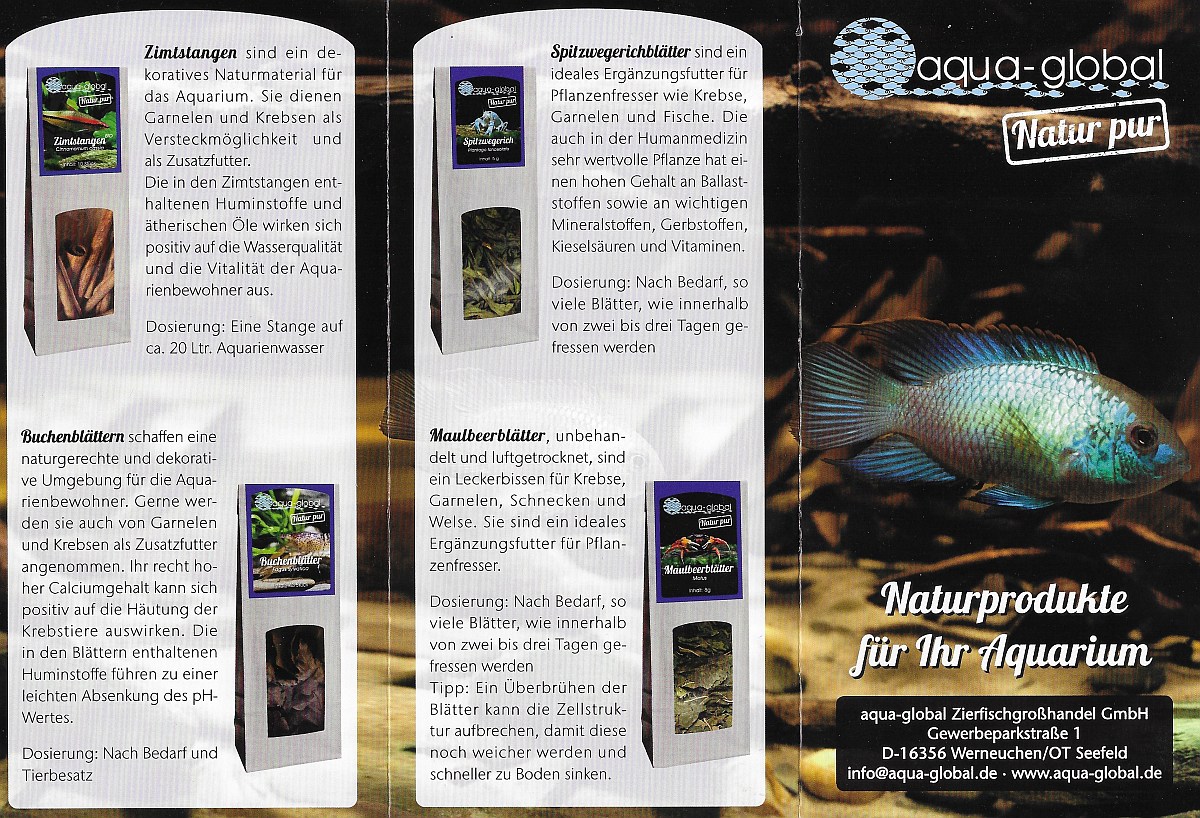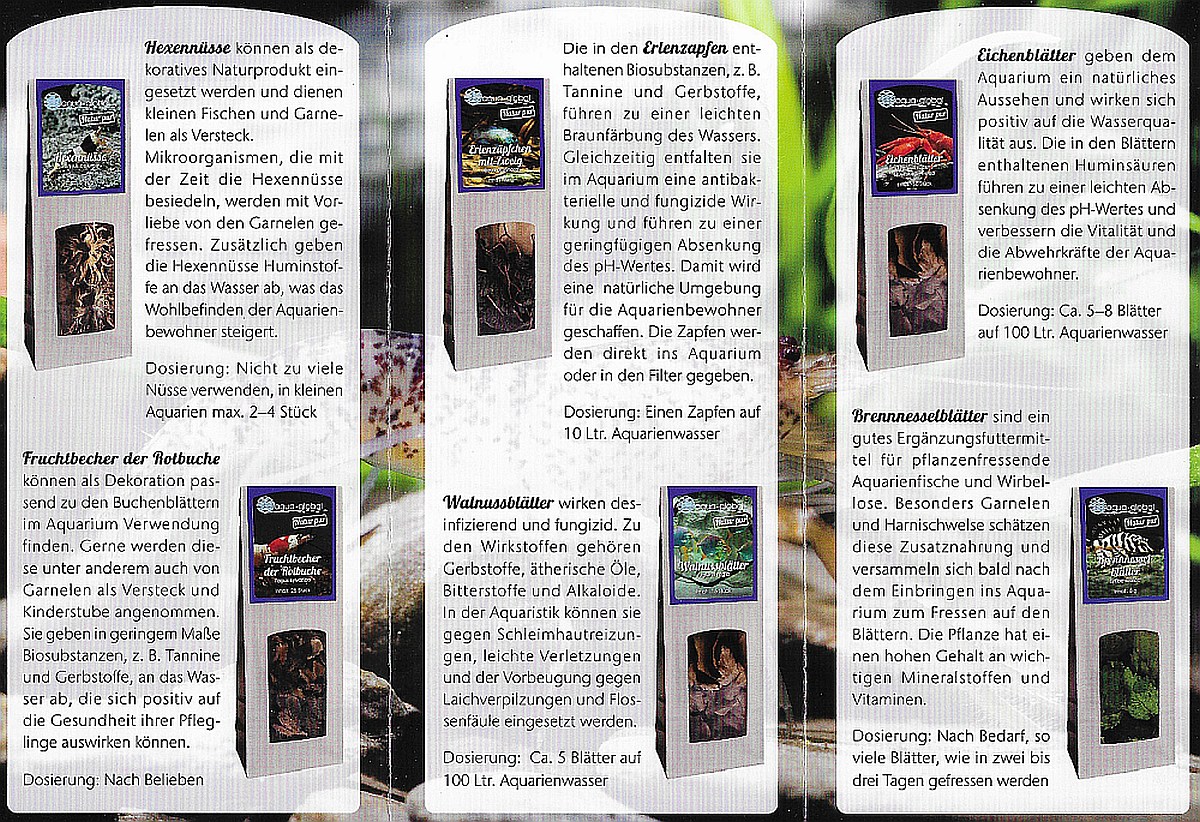 die Inhaltsstoffe benannt. Bewährt hat sich Die Hauptmasse bilden nach Hersteller-Angaben zu "... ca 88 % Huminsäuren, die restlichen 12 % verteilen sich größtenteils auf die Asche (Mineralien)... Die gelösten Huminstoffe binden bevorzugt Schwermetallionen und andere Schadstoffe. ". ![]() Wenn (für andere Produkte) erklärt wird, das Wasser erhalte "keine störende Gelbfärbung", dürfte sich der Anteil kohlenstoffhaltiger Huminstoffe in engen Grenzen halten. ![]() ![]() Das Biotop vervollständigen viele, nicht zu den Huminstoffen gerechnete, aber ebenfalls natürliche und wichtige organische Biosubstanzen