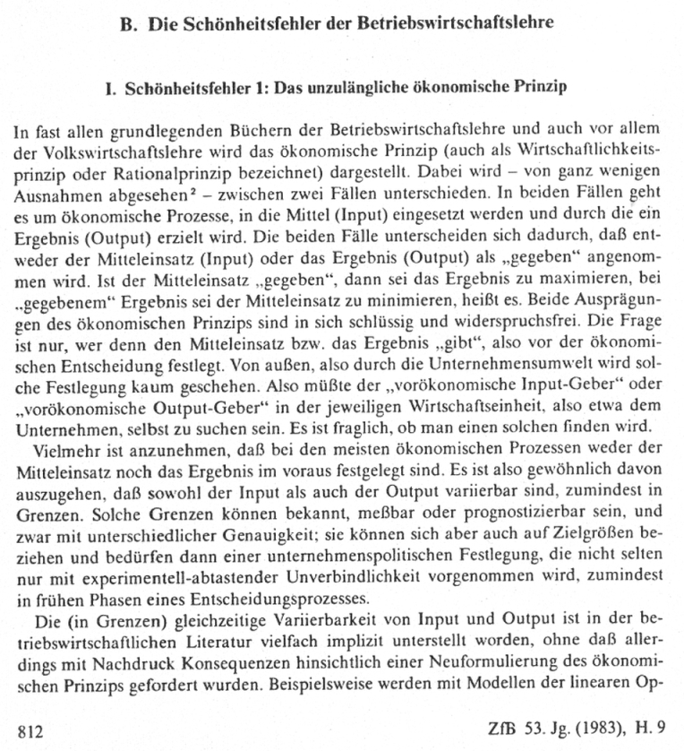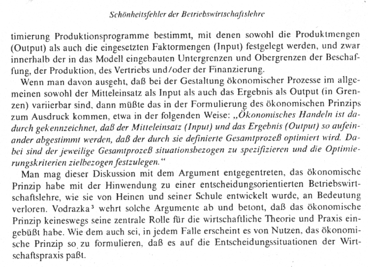 Determinal-Prinzip als Grundlage der Systemanalyse Generell ist Wirtschaftlichkeit (W) eine geeignet festzulegende Funktion der beiden Parameter Aufwand (A) und Nutzen (N). Ziel des natürlich wirtschaftenden Menschen ("homo oeconomicus") sei es, mit seinen Handlungen größtmögliche Wirtschaftlichkeit zu erreichen. Die Wirtschaftlichkeit als Kosten-Nutzen-Relation kann unterschiedlich definiert werden, Beispiele sind 1. Nutzenüberschuss ("Gewinn") W = N - AWeder ist es notwendig noch zweckmäßig, Definitionsmöglichkeiten zu verallgemeinern; spezifische Situationen erfordern spezifische Definitionen. Beispiele finden sich in der Literatur. So zeigen Unternehmensziele, aber auch Abteilungsziele markt- und situationsbedingt große Unterschiede nud Dynamik. Da Wirtschaftlichkeit eine Funktion ist zweier Unabhängig-Variabler (A, N), ist ihre Variation auch von zwei Unabhängig-Variablen bestimmt, so dass es nicht generell eine eindeutige Lösung gibt, sondern nur in drei Spezialfällen: 1. Der Aufwand ist konstant, d.h. mit gegebenem Aufwand ist der Nutzen zu maximieren ("Maximal-Prinzip")Offensichtlich sind Maximal- und Minimal-Prinzip am einfachsten zu handhaben und deshalb auch am häufigsten publiziert. Das Determinal-Prinzip jedoch bildet die Grundlage jeder Systemanalyse, ist also sehr wohl existent, wenngleich zumeist übersehen. Regelmäßig beschriebene Beispiele für Ausprägungen dieses Prinzips sind das Turgot'sches Ertragsgesetz und die Laffer-Kurve. Die logisch zwingende Begründung erbringt die Mathematik, und das sieht so aus (Reihenfolge wie oben): Da W = fkt[ A, N ] ist vW = (dW/dA) vA + (dW/dN) vN [ "(dY/dX)" seien partielle Diffentiale, "vX" Variationen ] 1. Wenn A = const , dann vA = 0 , somit vW = (dW/dN) * vN Das Determinal-Prinzip (3) wurde meines Wissens erstmals von mir definiert und zwar 1973 in der Zeitschrift "Truppenpraxis" als erster Schritt eines angehenden Ingenieurs in die Wirtschaftswissenschaften. Ich habe es damals so benannt, weil die treffendere Bezeichnung "Optimal-Prinzip" häufig für das Minimal-Prinzip verwendet wurde. Das Bestreben, aus Angst vor genau definierten Extremfällen ein weiteres Prinzip nach dem Motto "soviel wie möglich (Nutzen) mit sowenig wie möglich (Aufwand)" zu fordern, ist als unsauber abzulehnen, weil keine nachvollziehbare Definition möglich erscheint und sich Ergebnisse jeglicher Bewertung entziehen. Das gilt natürlich auch für ein "Extremumprinzip (auch Optimumprinzip): Ein optimales Verhältnis zwischen eingesetzten Mitteln und angestrebtem Nutzen zu erreichen...", was immer dieses "optimale Verhältnis" sein mag. Der in diesem Zusammenhang oft genannte Andler-Ansatz zur Bestellmengen-Optimierung ist ja ein geradezu klassisches Beispiel für das Minimal-Prinzip: Eine vorgegebene Jahresmenge mit minimalen Kosten bestellen! Dazu zitiere ich gerne einen Beitrag aus der diesbezüglichen Wikipedia-Diskussion (dort Nr 4), Autor --straktur (Hervorhebung von mir): Es ist ein weitverbreiteter Irrtum, dass es besonders sinnvoll sei zu versuchen, mit minimalem Mitteleinsatz (Minimalprinzip) ein maximales Ergebnis zu erzielen (Maximalprinzip). Dies sogenannte Min-Max-Prinzip (auch Optimalprinzip) führt jedoch zu ungeplantem Handeln, da nach dem Minimalprinzip keine klaren Vorgaben gemacht werden und nach dem Maximalprinzip kein klares Ziel verfolgt wird - außerdem hieße das, im Extremfall alles mit nichts erreichen zu wollen.