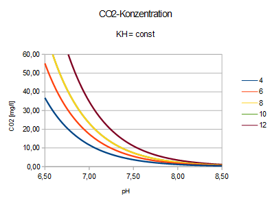 überproportinal. ![]() Für die Pflanzenzucht (Düngung!) ist bedeutend, dass sich aus den leicht messbaren Variablen pH und KH die CO2-Konzentration schnell (s.o.) errechnen lässt: CO2 = (KH/2,8) * 10^(7,91-pH) CO2 = KH * 10^(7,463-pH) ![]() Unter