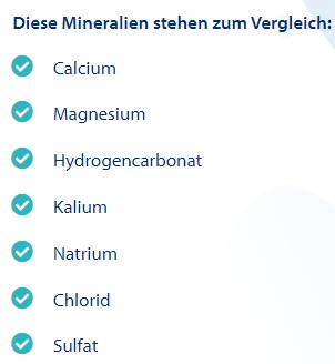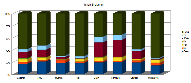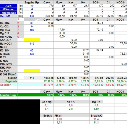 ist eben anders zu steuern als die Grund-Mineralisierung. Die rote Soll-Zeile "Gessner10" als Zielsetzung kann durch andere Gewässer (zB Amazonas, Mississipi, Malawi ) ersetzt werden. In den ersten Zeilen wird das zu optimierende Basis-Wasser (zB Stadtwasser gem Analyse und/oder demineralisiertes Osmose-Wasser) eingegeben, welche mineralisiert werden soll (Hier beispielhaft das Leitungswasser in Neumünster). Die Zeile "GerolM" enthält ein Mineralwasser, das die Salz-Zugabe ergänzt (s.u. - vgl auch Krause "Wasser" S 140f) - es kann ersetzt werden. Als Beispiel (in blauen Zahlen) ist enthalten die Rezeptur für Gessner-100. ![]() Mineralwasser Mit den genannten Salzen ist es augenscheinlich nicht möglich, demineralisiertem Wasser die Gessner-Struktur zu verleihen, da die Erdalkali-Hydrogenkarbonate nicht als trockene Substanz existieren; es müssen Flüssigkeiten eingesetzt werden, in denen sie enthalten sind. Dazu ist eine Vielzahl von Mineralwässern verfügbar. ![]() Der verlinkte Mineralienrechner umfasst die Struktur-Daten von weit über tausend Produkten. ![]() Geeignet