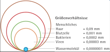 Die Materie-Teilchen schwirren frei durcheinander, treffen sich, verknüpfen sich, trennen sich wieder - je energetischer, desto schneller und hektischer, was sich als Wärme zeigt. Die meisten Stoffe, die in dieses Gewirr eintauchen, dissoziieren ebenfalls - die Gesamtheit der Ionen bewirkt Eigenschaften und Verhalten des Wassers. Die Größenverhältnisse sind hier logarithmisch dargestellt: ![]() Eine lineare Darstellung ist nicht möglich, denn: Angenommem, es betrage der Durchmesser des Modells vom Wasser-Molekül 1 [mm] dann der von Viren 0,3 [m] der von Bakterien 2 [m] der von Blutzellen 10 [m] der vom Menschen-Haar 900 [m] Ein menschliches Haar ist eine-million-mal so dick wie ein H2O-Molekül. ![]() Neumünster, 19.12.2023 *