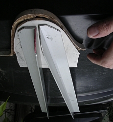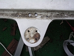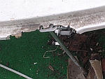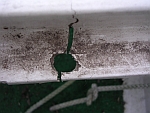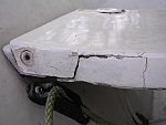 Diese Lösung verdanke ich einem Ex-Tasarianer aus Holland!Um das Blatt für den "Landgang" zu fixieren, benutze ich einen einfachen Bolzen/Schraube (per Bändsel irgendwo am Ruderkopf gesichert), wie aus den Abbildungen ersichtlich (die weiße Linie soll zum besseren Verständnis die verdeckte Kante des Ruderblattes andeuten): Noch im Wasser hebt der Skipper per Hand das