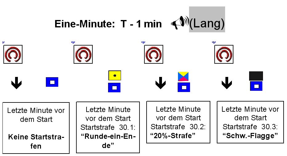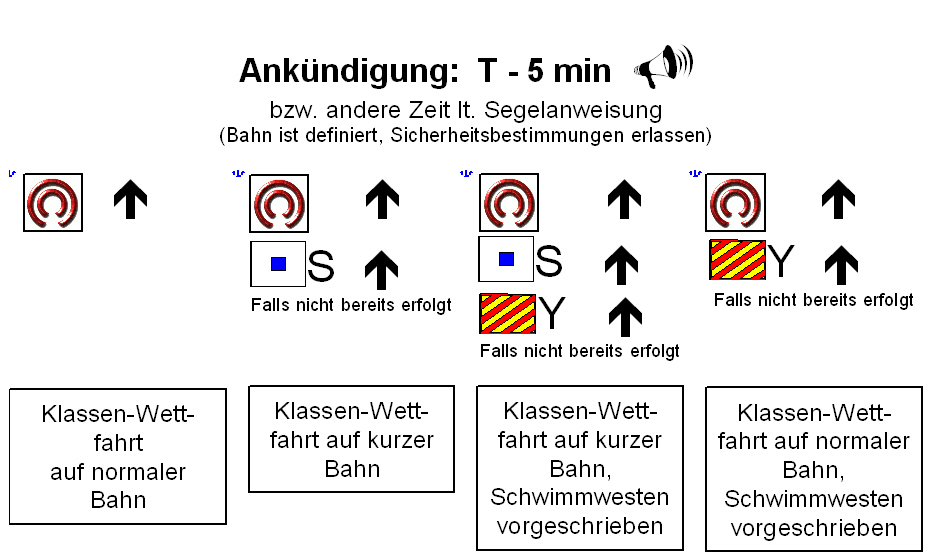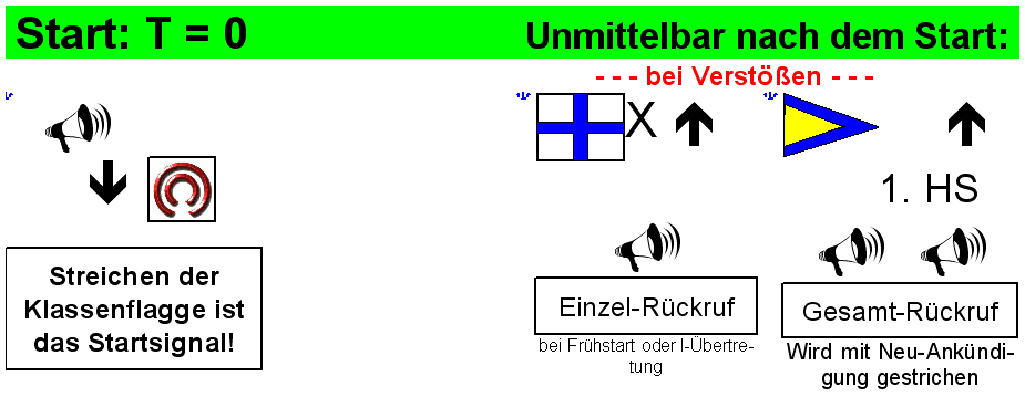 Die obigen Kleinformate sind verlinkt mit den ausdruckbaren Großformaten zum Downloaden. Natürlich sind solche Folien-Drucke bei der Redaktion zu haben - auf weiß oder silber... Die Bilder sind nicht unverständlich, oder? ![]() Bloß raus aufs Wasser! .Jetzt abschließend die Bahn verifizieren, Hauptkurs (s. "Kompass") notieren, Reihenfolge der Tonnen etc. Stoppuhr auf vier Minuten stellen, und Zeit beobachten. Noch ein Schluck aus der (Wasser-) Pulle. Spätestens jetzt wird's auch für die letzten Bummelanten höchste Zeit zum Ablegen, keine fremde Hilfe mehr in Anspruch nehmen. In die Nähe des Startschiffes segeln. ![]() Anmerkung: Zumeist wird I / Z / Bl erst jetzt gesetzt anstelle von P ! Stoppuhr starten! Jetzt gelten die Wettfahrtsregeln, also auch Strafen bei Regelverstößen, Proteste etc - auch gegenüber Booten anderer Wettfahrten, anderer Klassen. Startlinie verifizieren, Windrichtung prüfen, Startposition überlegen. Zur Leeseite der Startlinie segeln. Wenn eine der obigen Strafflaggen gesetzt ist: Keinesfalls mehr in der letzten Minute (T-1) auf die Luvseite der (verlängerten) Startlinie segeln! ![]() Uhr beobachten. Auf der Leeseite der Startlinie bleiben - auf jeden Fall, wenn Strafflaggen gesetzt waren. Wenn Platz ist, die Startlinie auf und ab segeln. Möglichst nicht ins Gewühle! Noch kann es Startverschiebungen geben (mit Doppel-Tuut) : ![]() Doch jetzt geht es los: ![]() Es zählt das Heruntergehen der Klassenflagge, nicht das Tuut des Nebelhorns! Und das passiert exakt 240 sec nach dem Vorbereitungssignal T-4 (Blauer Peter oder I / Z / Black geht hoch)! Wenn wir glauben, der Einzel-Rückruf gelte uns, dann ... Bei Gesamt-Rückruf alle wieder zurück in Lauerstellung. Der 1.Hilfstander (so heißt jene Flagge) wird gestrichen, wenn die Klassenflagge für T-5 gestzt wird. Das Allerschönste: Wenn man letztendlich abgekämpft die Ziellinie überfährt, ertönt ein lautes "Tuut" vom Zielschiff - in dem Augenblick noch schöner als der Bayerische Defiliermarsch! Und das war's dann, bis zum nächsten Lauf! Aber dies kannt's auch geben: Bahnänderungen pflegen an der betreffenden Bahnmarke durch das Begleitboot signalisiert zu werden ![]() Noch blöder: ![]() ![]() Was zu den unschönen Protesten zu sagen ist, verschieben wir auf später, um uns nicht jetzt schon die gute Laune verderben zu lassen... | ||||||